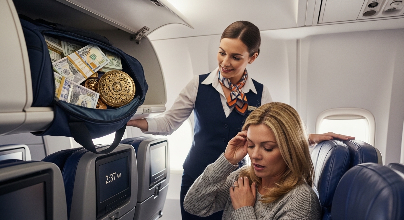 “Ma’am,” the flight attendant whispered, gently tapping my shoulder. “Sorry to wake you but your husband stepped away. He asked me to tell you when he did. I think… I think you should check his carry-on.”