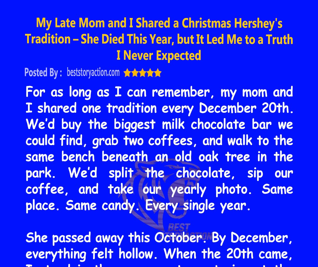 Every December 20th, my mother and I shared one perfect ritual: a giant Hershey’s bar, two coffees, the same park bench. She died in October. When I went alone …